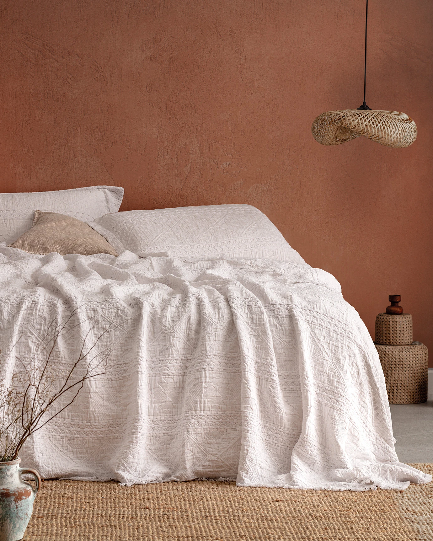 Ethnique Double Bedspread - White This bedspread will add an elegant touch to your bedroom with its stylish and modern design. It will improve your sleep quality with its soft and comfortable texture.Technical Specifications: Product Type: Double Fabric Type: 80% Cotton, 20% Polyester color :white Product Barcode: 8682116910262 production location: turkey Dimension: Bedspread: 230x240 cm Pillow case: 50x70 cmPackage Includes: Bedspread 1 Piece Pillowcase: 2 Pieces