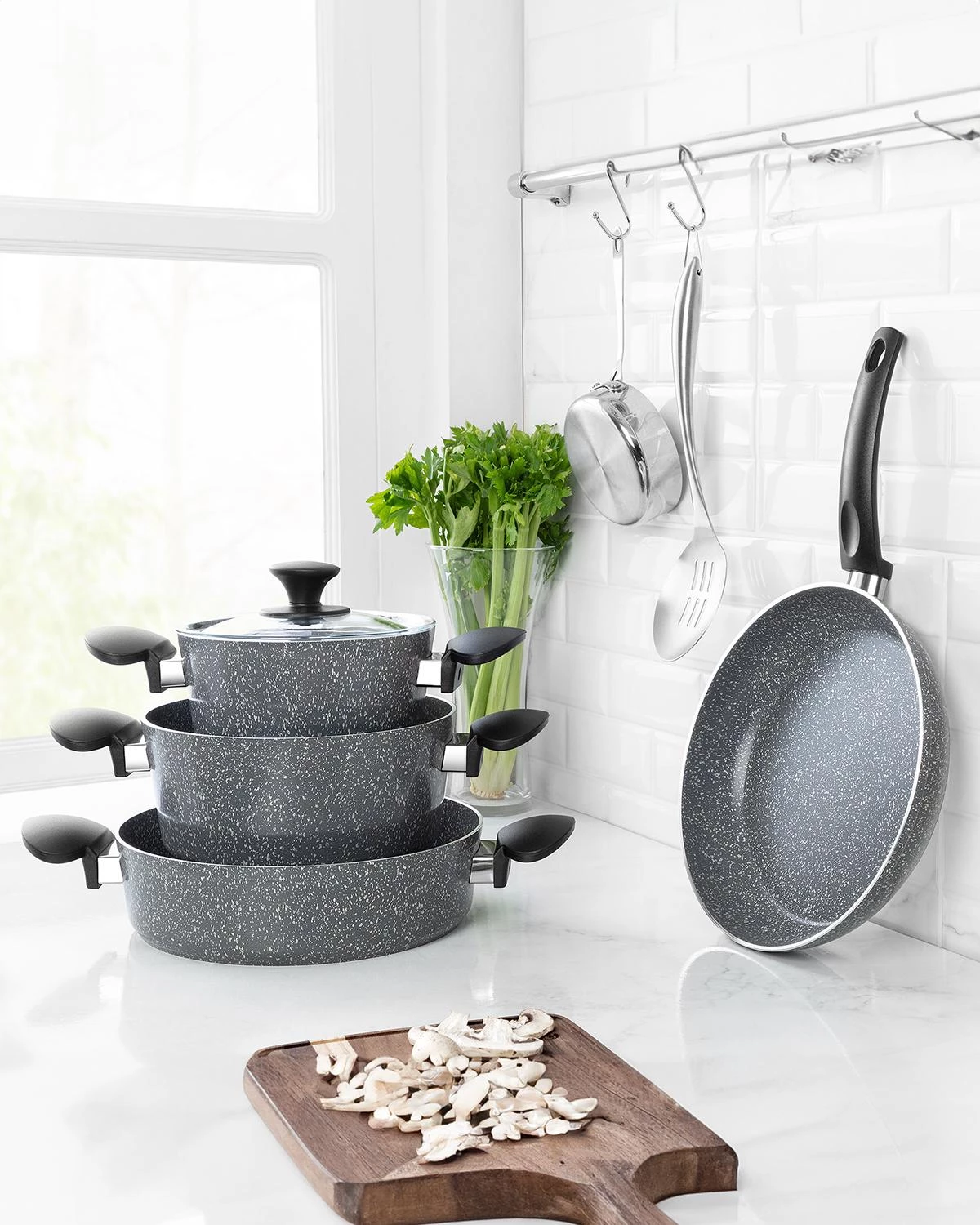 Offering Everything You Need To Prepare Your Favorite Dishes; Gordes Granite Look 7 Piece Cookware Set Gives You A Healthy And Delicious Cooking Experience. Its Non-Stick Surface Makes Cooking And Cleaning Practical And Provides Ease Of Use. Thanks To Its Scratch-Resistant Structure; It Can Be Used Easily For Many Years. You Can Catch Taste And Harmony In Your Kitchen With Modern And Stylish Color Options.