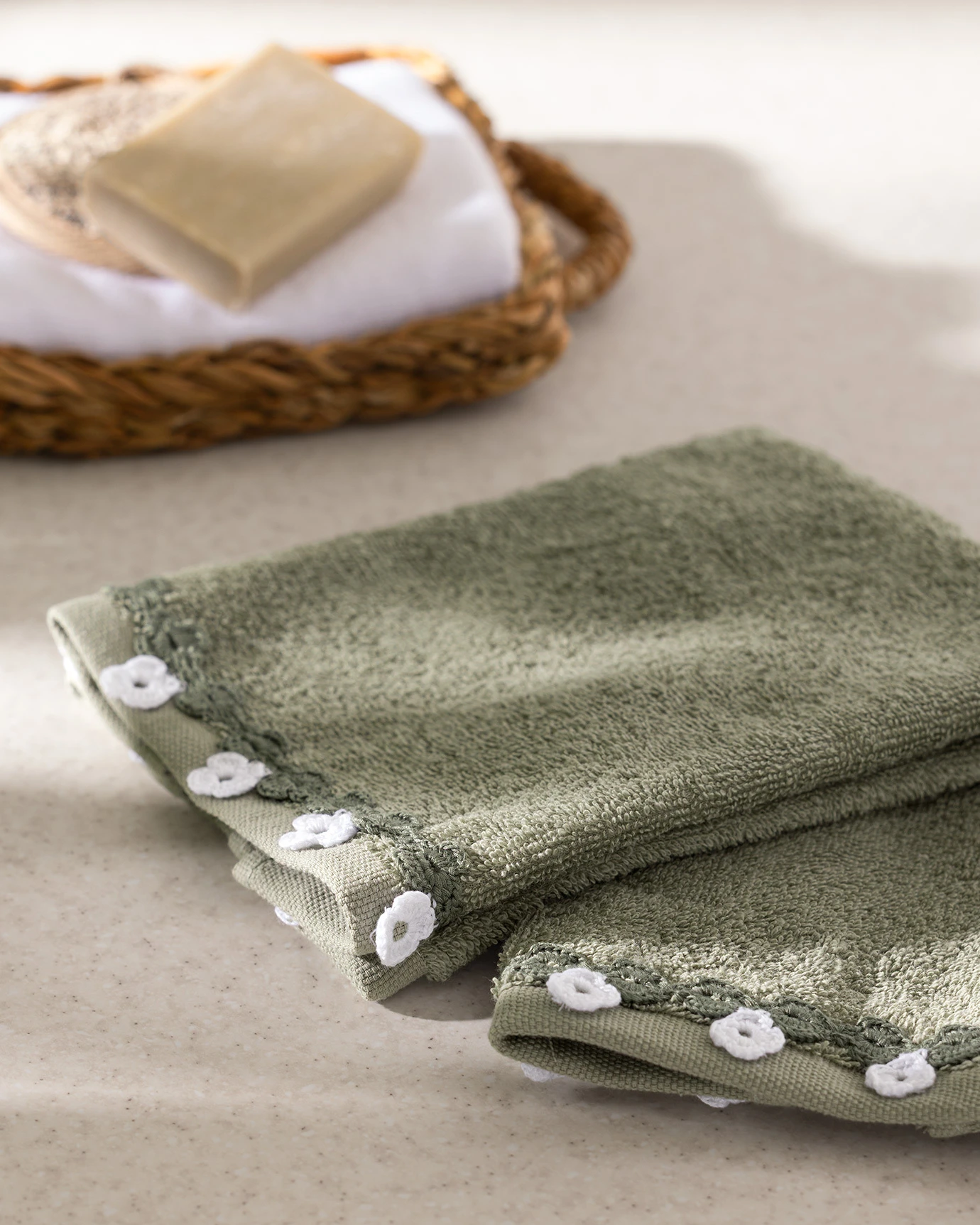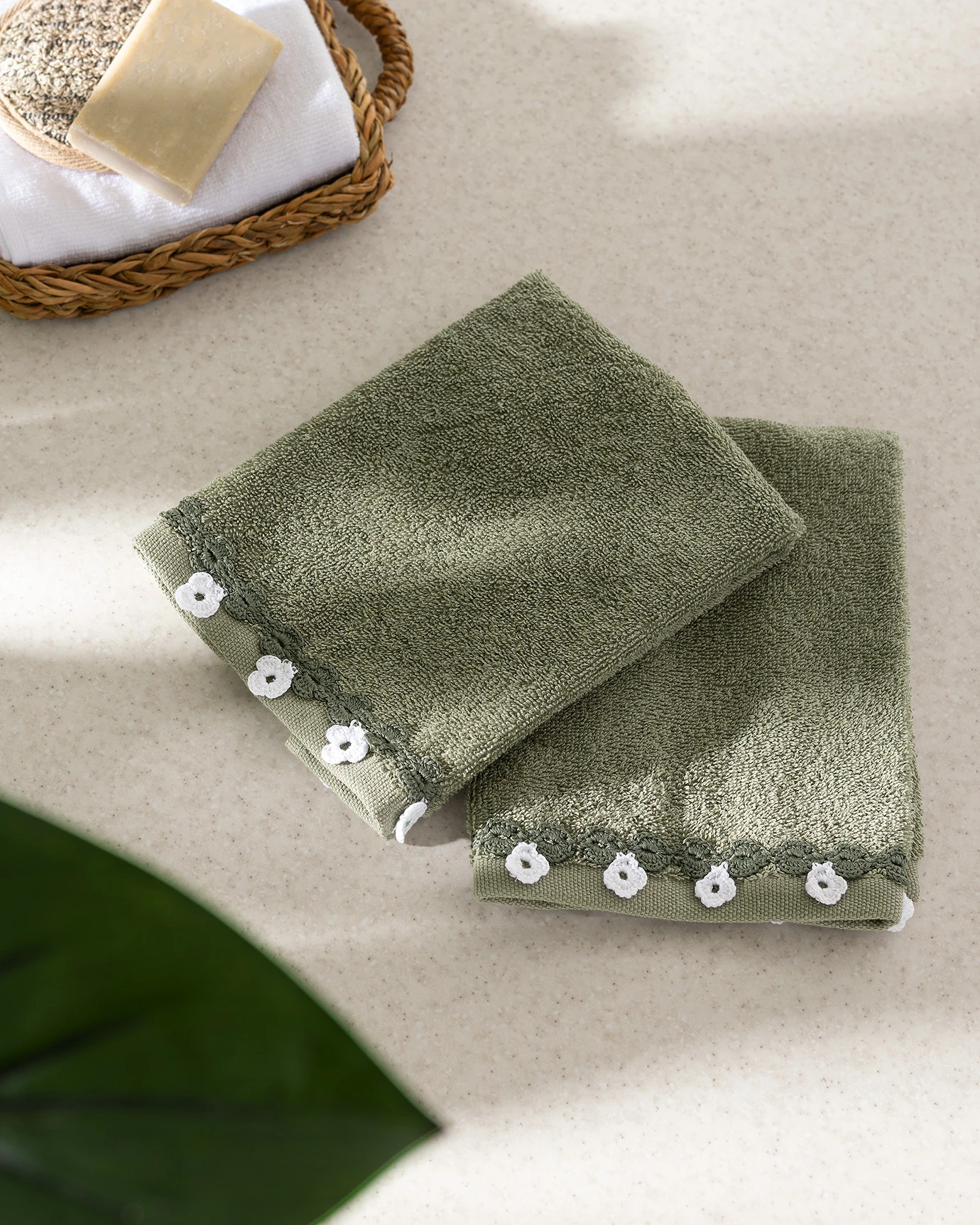 Jeanne Crocheted 2-Piece 100% Cotton Hand Towel Set - Green - 30x40 cmWhether you use this hand towel set daily or save it for guests, it brings a touch of simplicity to your bathroom. Madame Coco is pleased to present this towel set, which will add a fresh touch to your bathroom and brighten your day every time you see it.Technical Specifications: Fabric Type: 100% Cotton Color: Green Size: 2x(30x40) cm GSM Weight: 450 g/m² Production Place: TurkeyPackage Content: