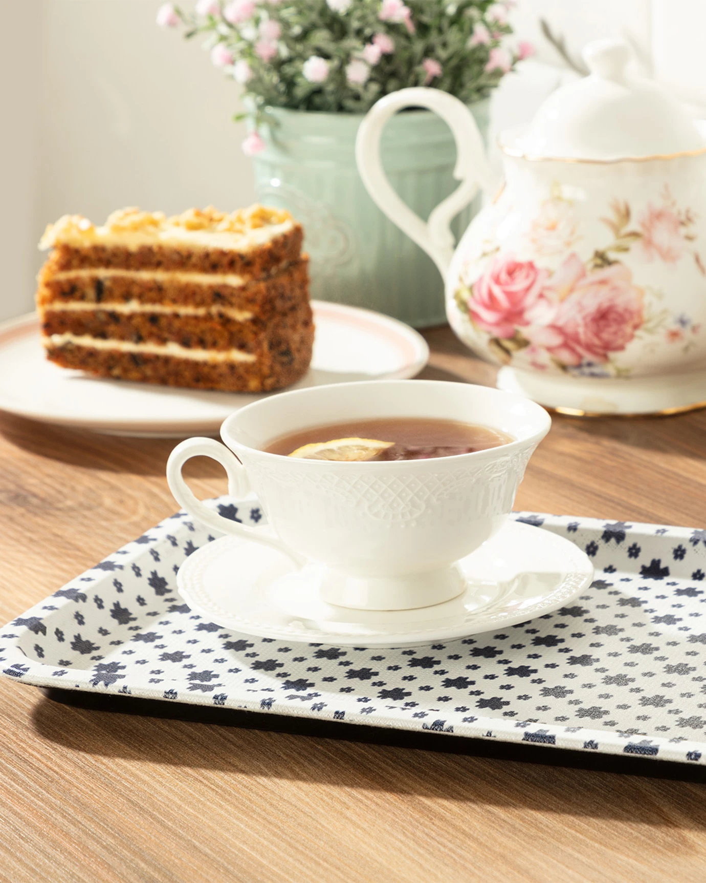 Product Description:Rêve Bleu Petite Fleur Rectangular Non-Slip TrayThe high-grip surface of the Rêve Bleu Petite Fleur Rectangular Non-Slip Tray, decorated with many large and small flowers, will make your presentations easier. Rêve Bleu Petite Fleur Rectangular Non-Slip Tray, which has ideal dimensions to fit your treats for 2 people comfortably, offers the opportunity to experience the quality of Madame Coco.Technicial Specifications:Product Type: Leather Covered Anti-Slip PlasticDimensions: 31x21x2 cmPlace of Production: TürkiyePackage Content: Tray: 1 Piece