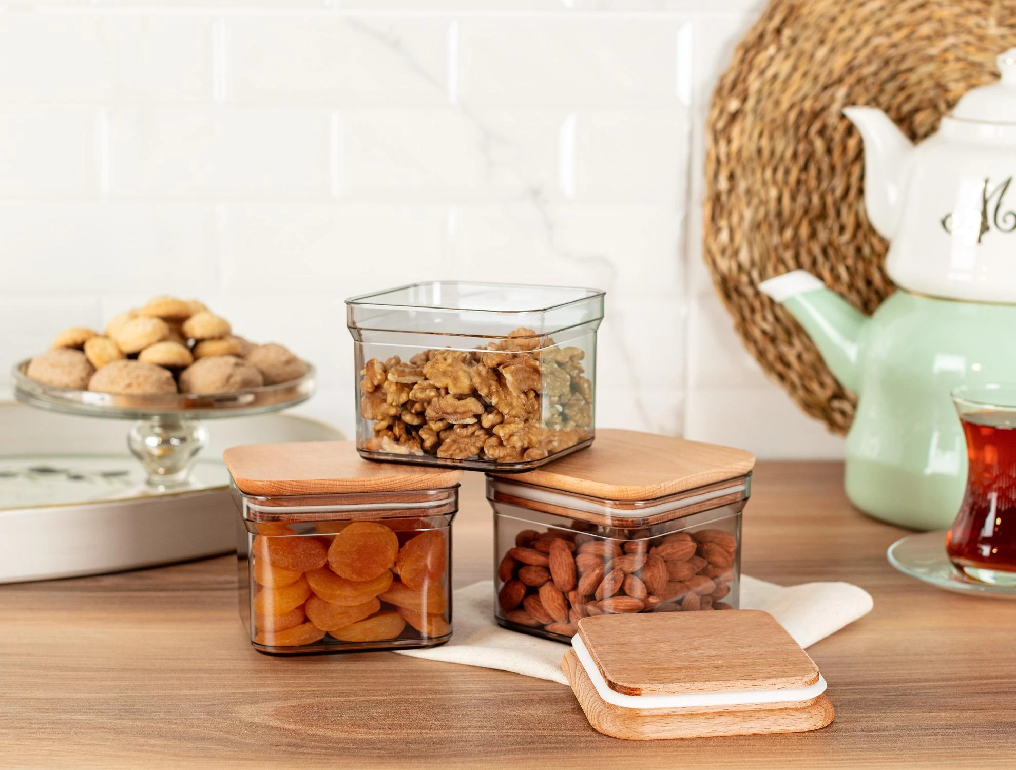 Storage containers, where you can safely store your dry food, will help you maintain order in your kitchen with their ergonomic designs. The storage container, which will be in perfect harmony with your kitchen, will keep you away from insects and dampness as much as possible with its lids.