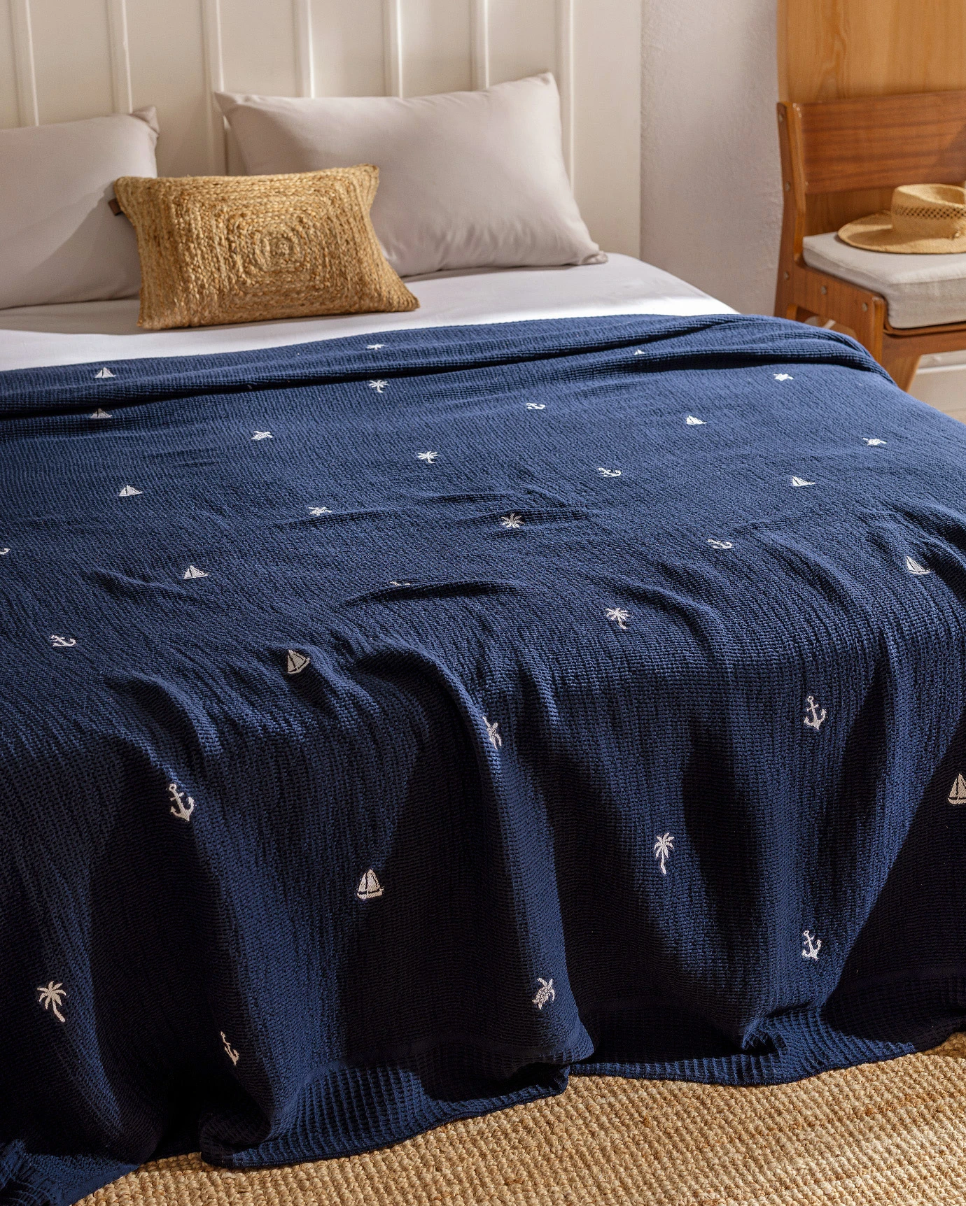Riva Double 100% Cotton Bedspread - Navy BlueWith its modern textured design, this bedspread has a very elegant and stylish look and will bring a brand new comfort to your bed...Technical Specifications:Product Type: DoubleFabric Type: 100% CottonColor: Navy BlueDimensions: 220x230 cmPlace of Production: TurkeyPackage Contents:Bedspread: 1 PieceWashing Instructions:*Wash at 30 degrees.*Do not use bleach.*Do not tumble dry.*Iron at low heat.*Do not dry clean.