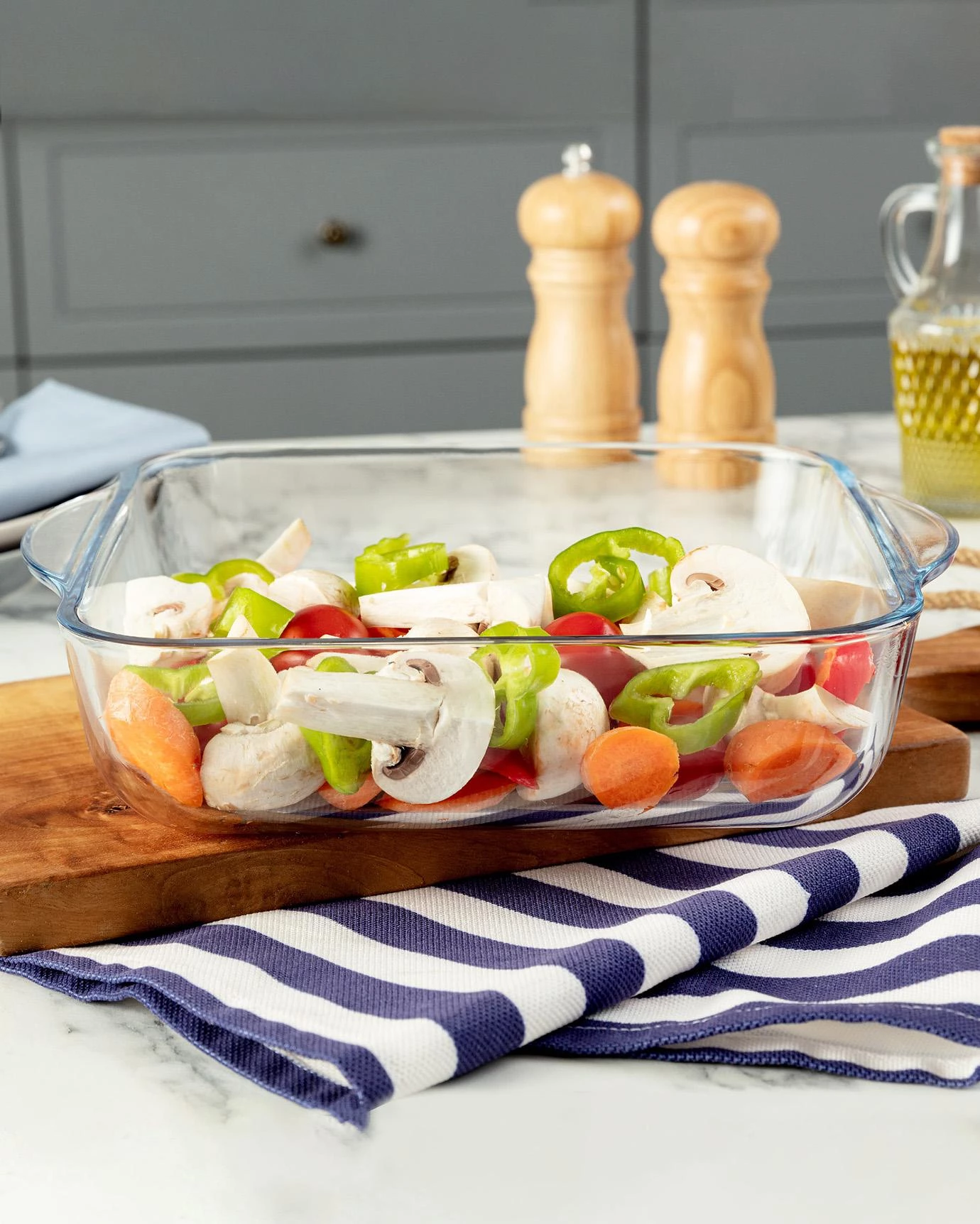 Savona Small Square Glass Oven Dish with Grid - Single makes your meals even more delicious thanks to its grid base surface, while it is resistant to high heat and suitable for recycling thanks to its borosilicate glass raw material. It can be easily washed in the dishwasher after each use.